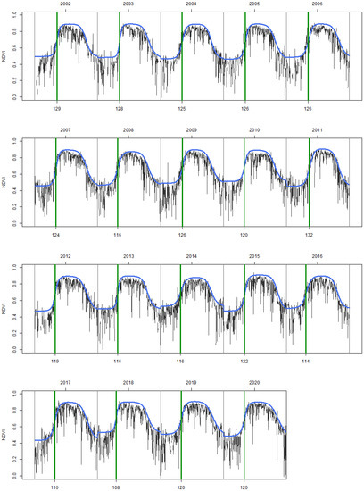 Long-term and continuous monitoring and assessments are of high importance in phenology as phenological shifts are not fixed processes; they do not only advance or delay but can also be observed to halt or reverse, slow down, or accelerate depending on the chosen time period [144,145,146]. Although 19 years can hardly be defined as “long term” in both statistical and natural processes contexts, to be able to work with daily data we chose the MOD09GA collection and to investigate the longest continuous period possible, we included the entire temporal coverage of the collection except for the aforementioned 2 years which were excluded.