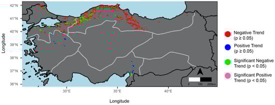 Despite the immediate climate threat and vulnerability of natural ecosystems, LSP studies in Turkey are almost exclusively limited to plants of agricultural and/or economic value, i.e., vegetation under human intervention. Turkey can be found as “a part of the study area” in European, Asian, or Northern Hemisphere LSP studies conducted with coarse–medium spatial resolution composite datasets (e.g., [98,99,100]). However, we could not find any previous study explicitly analyzing the long-term trends of phenological parameters and shifts of Turkey’s natural forest covers, with a clear phenological parameter extraction and sub-pixel information at species level.