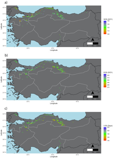 According to the satellite-derived (AVHHR-NDVI) budburst timing evaluation in [79] made for beech and oak, the SOS dates our estimations produced (Figure 3) which are about late April–early May are realistic. Our SOS date estimates for the years 2015 (DOY 122) and 2016 (DOY 114) also show high accordance with the ground-based sensor-obtained green-up date intervals for beech (2015; DOY 115–129 and 2016; DOY 114–129) in [149] where they validated different satellite phenology products (MODIS Terra/Aqua and Sentinel 2A) by multi-sensor ground measurements. It is worth noting that, despite the fact that phenological parameters extracted from satellite data (e.g., SOS) are commonly found either earlier or later than the ground-observation-based (sensors or traditional) bud-burst/green-up dates by varying time scales from days to weeks, our results are in concert with the dates in the reviewed literature. However, due to the fact that geography plays a crucial role in phenology, even for the same species, different SOS dates are observed for different locations, which should also be noted.