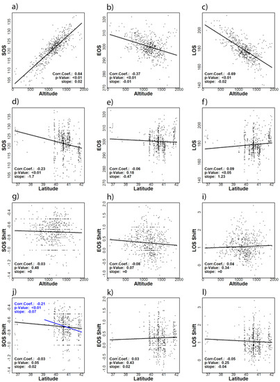 Correlations between multi-annual mean of SOS, EOS, and LOS of individual pixels and altitude (a, b and c respectively) and latitude (d, e and f respectively) and correlations between the shifts (Sen’s slope) in SOS, EOS and LOS of individual pixels and altitude (g, h and i respectively) and latitude (j, k and l respectively). Blue color in (j) remarks the correlation between SOS shift and latitude for the pixels between 39° N and 42° N while black color includes all pixels in study area.