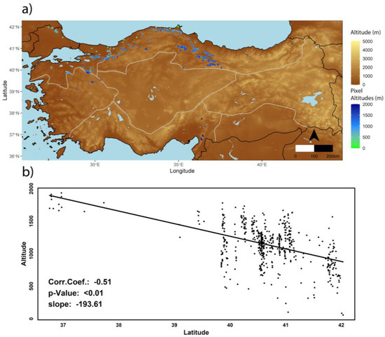 Respective altitudes of study pixels (a) and latitudinal distribution of respective altitudes of study pixels (b).