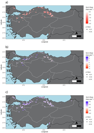 Figure 8a shows the significant SOS trend and EOS (Figure 8b) and LOS (Figure 8c) trends of the same pixels over the study period. Unlike the mean SOS dates and mean LOS, no significant relationship between the SOS and LOS shifts and altitude was found (Figure 6g,i) as well as EOS (Figure 6h). For latitude on the other hand, a weak negative correlation was found which was apparent after latitude 39° N (Figure 6j), albeit not for all pixels, meaning that the shift increases northwardly, represented as −0.07 days per year−1. For the EOS and LOS shifts, no significant correlation with latitude was found (Figure 6k,l).