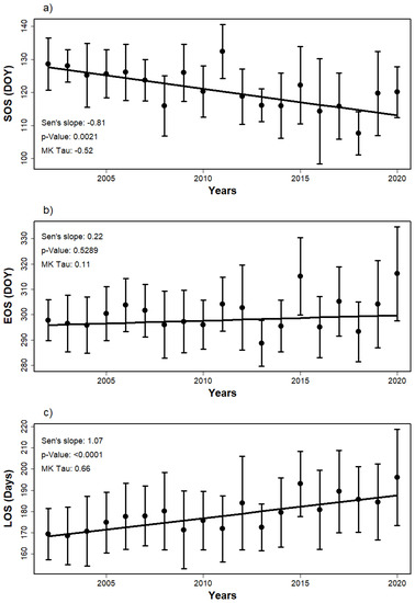 Because there is usually high positive autocorrelation between consecutive observations in NDVI time series, they often violate the assumption that “all ordinate values (y axis) should be mutually independent” of regression analysis which is frequently used for trend analysis in LSP studies [1,134]. Thus, trend analysis of SOS was conducted with a non-parametric Mann–Kendall (MK) test for each pixel. To calculate the slopes of the SOS, LOS, EOS, and temperature-derived variable trends, Sen’s Slope estimator was used. A negative Sen’s slope estimation indicates a decreasing trend while a positive estimation means an increasing one. Lastly, MK Tau presents a measure of strength. The closer Tau gets to +1, a stronger and increasing relationship is implied, while the closer it gets to −1, a stronger decreasing relationship is implied. Both the Mann–Kendall test and Sen’s Slope estimations were realized with a R package named “EnvStats” [135].