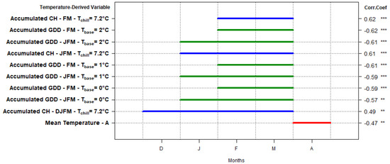 Significant correlations between the mean SOS trend and temperature-derived variables/intervals (*** p < 0.01, ** p < 0.05) ranked by correlation coefficients. CH = chill hours; GDD = growing degree days; D, J, F, M, and A stand for December, January, February, March, and April, respectively. Colored lines signify monthly intervals as line length shows the months included in the interval and colors show variable type as blue = CH, green = GDD, red = Tmean.