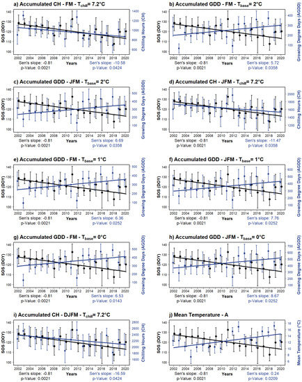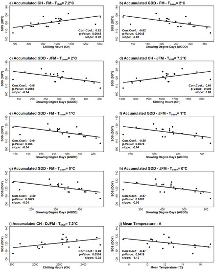 We investigated the relationship between the trends of AGDD, CH, and mean, maximum, and minimum temperatures (Tmean, Tmax, and Tmin, respectively) and the trend of the mean SOS dates of 19 years to see (i) if any of these variables have a significant linear relationship with the mean SOS trend and (ii) linear relations between the mean SOS trend and variable/s and related interval/s with the highest significance. GDD was calculated as: