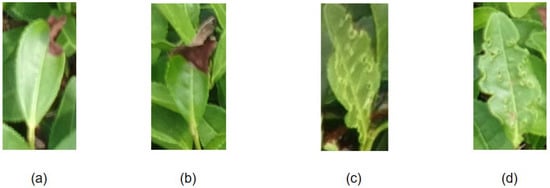 We used a drone (DJI Mavic Air 2) and a mobile phone to take images of tea leaf diseases and insect infestations about 50 cm above the tea trees. Our images include images of one disease leaf and one pest leaf, namely, tea leaf blight and green mirid bug. The scientific name of green mirid bug is Apolygus lucorum (Meyer-Dür) [28]. The pest, green mirid bug, is represented by images of tea leaves that have been bitten by the green mirid bug. Some representative samples of our dataset are shown in Figure 1.