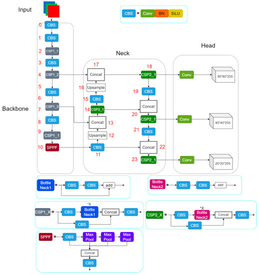 As shown in Figure 2, YOLOv5s-6.1 is divided into four parts: input, backbone, neck, and head. Cross-stage partial 1 (CSP1) and cross-stage partial 2 (CSP2) in the backbone and neck of YOLOv5 are designed with reference to the cross-stage partial network (CSPNet) [30] structure. CSP1 is used for feature extraction in the backbone section. CSP2 is used for feature fusion in the neck section. In the backbone, there is a spatial pyramid pooling fast (SPPF) module in addition to the CSP1 module. The function of the SPPF module is to extract the global information of the detection target. In the neck, YOLOv5 uses the path aggregation network (PANet) [31] structure. The PANet structure not only merges the extracted semantic features with the location features, but also the features of the backbone with the head, so that the model obtains more abundant feature information. Finally, the head consists of three branches, with feature maps of different sizes used to detect target objects of different sizes.