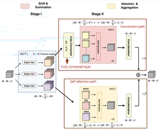 Convolution and self-attention are two powerful techniques for representation learning [24]. Pan et al. [24] proposed a mixed model that enjoys the benefit of both self-attention and convolution (ACmix). The structure of ACmix is shown in Figure 4.