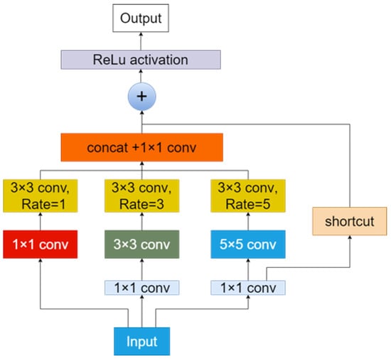 The structure of RFB is shown in Figure 5. Firstly, the parameters were reduced by 1 × 1 convolutional dimensionality reduction. Secondly, 1 × 1, 3 × 3, and 5 × 5 convolutions are performed to simulate different scales of perceptual fields. Thirdly, the 1 × 1, 3 × 3, and 5 × 5 convolution kernels are connected with the 3 × 3 dilated convolutions corresponding to expansion rates of 1, 3, and 5, respectively. Finally, the output of each branch is concatenated to fuse different features and improve the network model’s ability to represent different-sized targets. In addition, the RFB module also adopts the shortcut in ResNet, which can effectively mitigate the gradient disappearance and improve the training performance of the network.