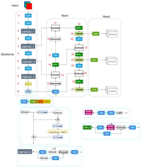 First, we added the ACmix and CBAM modules to address the issue of false detection caused by small targets. We then enhanced retaining the global information of small tea disease and insect pest targets by swapping the SPPF module out for the RFB module. In order to reduce the number of parameters and boost performance, GCnet and YOLOv5s were finally combined.
