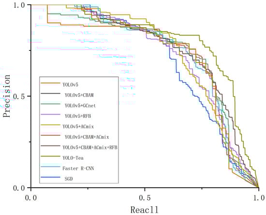 The precision–recall curves of the results of the ablation and comparison experiments are shown in Figure 8.