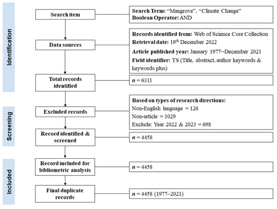 Clarivate Analytics’ Web of Science (WOS) platform was used to generate the metadata for the present study, and Core Collection (WOSCC) database was the only main dataset used for the purpose. There are two different keywords used to perform the search activities: “mangrove” and “climate change”. For the mangrove, the appropriate synonym is (“mangrove*”) OR (“mangrove* forest”) OR (“tidal forest”), which is based on the previous studies by Ho and Mukul [40], Mohd Razali et al. [41], and Saravanan and Dominic [42]. For the climate change related elements, the keywords were based on the modifications by Azra et al. [45], which are (“climat*”) OR (“climat* chang*”) OR (“global warm*”) OR (“seasonal* variat*”) OR (“extrem* event*”) OR (“environment* variab*”) OR (“anthropogenic effect*”) OR (“greenhouse effect*”) OR (“sea level ris*”) OR (erosio*) OR (“agricult* runoff”) OR (“weather* variab*”) OR (“weather* extrem*”) OR (“extreme* climat*”) OR (“environment* impact*”) OR (“environment* chang*”) OR (“anthropogenic stres*”) OR (“temperature ris*”) OR (“temperature effect*”) OR (“warm* ocean”) OR (“sea surface* temperat*”) OR (heatwav*) OR (acidific*) OR (hurrican*) OR (“el nino”) OR (“el-nino”) OR (“la nina”) OR (la-nina) OR (drought*) OR (flood*) OR (“high precipit*”) OR (“heavy rainfall*”) OR (“CO2 concentrat*”) OR (“melt* of the glacier*”) OR (“melt* ice*”) OR (“therm* stress*”) OR (“drought”) OR (“hypoxia”). Full bibliometrics records and cited references from WOSCC were downloaded in the Plain Text File (.txt) format, in which each download was limited to only 500 data entries.