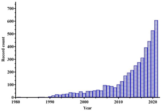 The search identified 4458 papers related to the impact of climate change on mangroves between 1977 and 2021 (Figure 2). The earliest article relating the climatic impact on mangroves was the study titled “Reconstructing Triassic vegetation of eastern Australasia”, which was published in 1977 by Retallack [46], and which stood for the pioneering approach in dating and mapping fossil plant associations, which included Pachydermophylletum (a mangrove scrub) and Linguifolietum (coastal swamp woodland) from the Pacific margin of Gondwanaland during Middle Triassic time. There has been a strong upsurge in publications relating to topics of interest during the past decade, suggesting that academia is paying increasing attention to this subject. We found that 77.2% of the datasets, or 3517 papers, are from the past decade (2011–2021), with 2283 of those papers alone appearing in the last five years (2017–2021). All the articles recorded on mangrove forest-related studies in this review were distributed in 911 journals. Estuarine, Coastal and Shelf Science ranked first in the number of publications (221), followed by The Journal of Coastal Research (113), Science of the Total Environment (85), Ocean & Coastal Management (79) and Estuaries and Coasts (78), (Table 1).