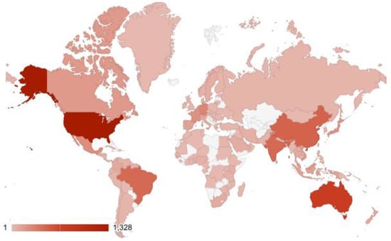 The countries involved in mangrove research, particularly looking into the impact of climate change, shows a striking disparity in the distribution of articles between continents. A total of 139 countries were detected (Figure 3). In terms of geographic distribution, the United States (1328 papers), Australia (734 papers), and China (477 papers) together accounted for more than 50% of the total number of publications (n = 4458). India, Brazil, Germany, Mexico, and England are next in order.