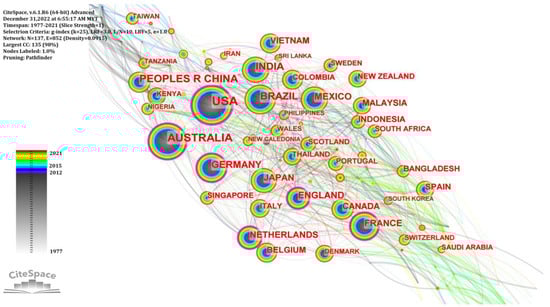 Research scholars’ cooperation in generating new scientific knowledge is called scientific collaboration [47]. Mangrove-related studies have specific geographical attention. Most researchers adopt the principle of proximity in the sample selected for their studies, so the geographical distribution among countries can reflect the depth and breadth of research on relevant aspects in different regions. There are 137 nodes and 852 linked lines in the country collaboration mapping from CiteSpace (Figure 4). The largest extent of mangroves is found in Asia (40.8%), followed by the Americas (30.4%), Africa (18.3%), and Oceania (10.4%) [48]. While the world’s remaining mangrove forests are spread across 118 countries, approximately 75% of mangroves are concentrated in just 15 countries which include Indonesia, Brazil, Australia, Mexico, Nigeria, Malaysia, Myanmar, Bangladesh, Cuba, India, Papua New Guinea, Guinea Bissau, Mozambique, Madagascar, and Philippines [49]. This is reflected in the country cooperation network analysis, where there are definitely large quantities of publications coming out from these 15 countries based on the size of the nodes. It was seen that some of the major contributors in the field of mangrove-related research were countries from the European Union, Japan, and England, despite having a meagre to no mangrove cover. This could be associated with the availability of funding from these countries to conduct research together with their partnering institutions worldwide (Table 2).