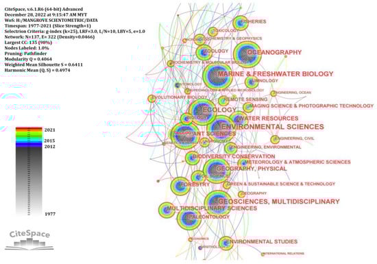 CiteSpace’s “Category” node type was used to generate a visualization map showing the disciplinary categories represented by 4458 papers analyzed in this study. The correlation burst detection analysis can detect the activity of research disciplines. After being simplified by pathfinder network scaling, an 86-node network of research discipline co-occurrence from 1977 to 2021 was obtained (Figure 5). The studies on the climatic impact on mangroves have been multifaceted through different disciplines, as demonstrated by the network map (Figure 5). The five research disciplines include Environmental Sciences, Marine Freshwater Biology, Ecology, Geosciences Multidisciplinary, and Oceanography. Environmental Sciences, the largest contributor with 31.5% of the total publications, provides a comprehensive understanding of the impacts of climate change on mangrove forests in relation to broader environmental issues. Marine Freshwater Biology, with 978 publications, focuses on the biological implications of changes in sea levels and salinity levels on mangrove forests and associated species. Ecology, with 812 publications, investigates the role of mangrove forests in coastal ecosystems and the consequences of their decline as a result of climate change. Geosciences Multidisciplinary, with 735 publications, examines mangrove forests’ physical and geological aspects, including their response to sea-level rise and increased extreme weather activities. Finally, with 630 publications, Oceanography explores the oceanographic processes affecting mangrove forests, such as changes in water temperature, circulation patterns, and wave patterns. These five research disciplines provide a comprehensive understanding of the impact of climate change on mangrove forests, integrating the environmental, biological, physical, and oceanographic perspectives.