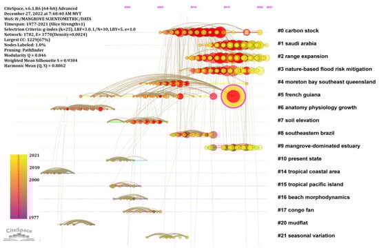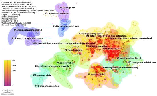 Cluster analysis is a popular method of statistical data analysis and knowledge discovery because of its ability to uncover latent semantic themes in textual data [50,51]. Cluster analysis can divide a large body of research data into various units based on the relative degree of term correlation, making it easier to identify the research themes, trends, and connections within a given field of study [51,52]. A cluster’s homogeneity can be quantified using an index called the mean silhouette, with values ranging from −1 to 1. The average silhouette value for each cluster was determined using CiteSpace. The higher the value, the more similar the cluster’s members are to one another [53]. The network showed 42 clusters in the context of the scientometric analysis mapping the link between climate change and mangroves (Table 3) and (Figure 6). In conducting this analysis, we employed the two primary algorithms available in Citespace, namely the Log-Likelihood (LLR) and Latent Semantic Index (LSI) algorithms. The LLR algorithm assesses the similarity between the text content and topics, while the LSI algorithm categorizes technical terminologies. The literature referenced by the citing literature from 1977 to 2021 served as the data source for the scientometric study carried out using the co-citation network of cited references, as shown in Figure 7.