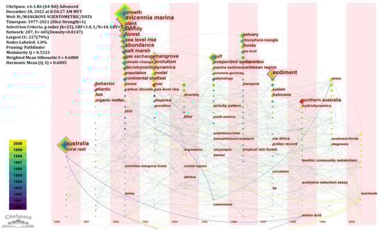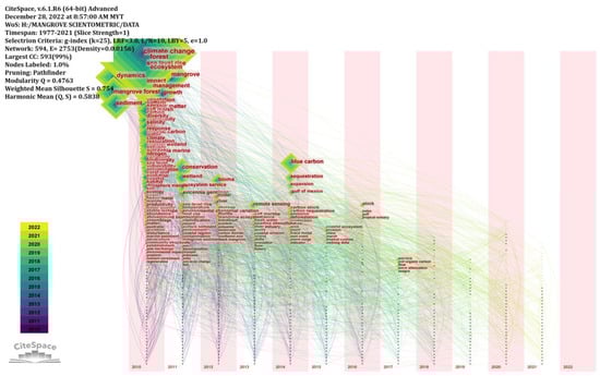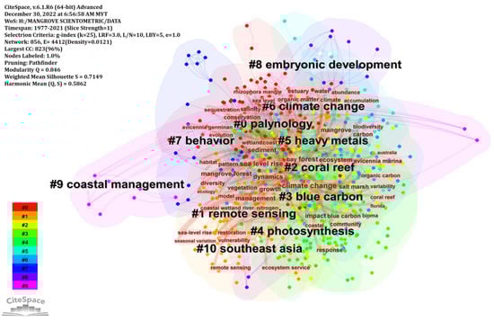 Co-occurrence analysis is based on the principle of counting the frequency with which a set of keywords appears in the same document, clustering these words based on the number of occurrences, reflecting the affinity of these words, and then analyzing the structural shifts of the disciplines and topics represented by these words [93]. Keywords, primarily words and phrases that describe the fundamental ideas of articles, can be used to track the development of research areas and domains [94,95]. We used CiteSpace to create a map of keyword occurrences and relative frequency, with the strongest burst keywords and co-occurrences highlighted and the mapping language deciphered in this study. From CiteSpace, 856 keywords and 4412 links were retrieved between 1976 and 2021. The broad array of research on mangroves was shown by many linked lines (more than the number of nodes—856) and complex linkages between keywords. Analysis of high-frequency keywords revealed 11 categories as research hotspots and frontiers in the field of climatic impact on mangroves (Figure 9): #0 “Palynology”, #1 “Remote sensing”, #2 “Coral reef”, #3 “Blue carbon”, #4 “Photosynthesis”, #5 “Heavy metals”, #6 “Climate change”, #7 “Behaviour”, #8 “Embryonic development”, #9 “Coastal management”, #10 “Southeast Asia”. Table 8 displays the results of a clustering classification of mangrove research and development based on the meanings provided by its keywords.