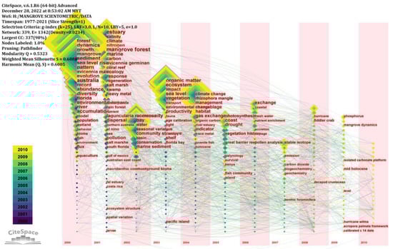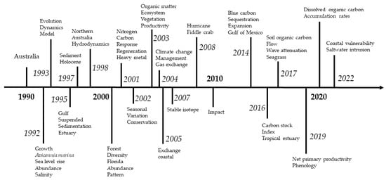 The relative importance of the keywords is represented by the size of the node. More significance is assigned to larger nodes [96]. Nodes that are close to each other have a higher relationship [96,97]. The rapid growth and shifting boundaries of a field can be traced back to the popularity of certain keywords. Rapidly increasing keyword searches can reveal shifts at the field’s cutting edge and foretell future growth patterns. These searches were shown in keyword co-occurrence networks from 1990–2000 (Figure 10), 2000–2010 (Figure 11), and 2010–2021 (Figure 12). Figure 13 presents the historical summaries and evolution paths of emerging research topics in mangrove–climate change studies based on the keyword analysis. The keywords appearing on the timeline have been listed chronologically and based on their frequency of usage. This timeline provides an overview of the development of research topics related to the impact of climate change on mangroves over the past thirty years. Notably, during 1990 to 2000, the research focus was on keywords such as “growth”, “evolution”, “dynamics”, ”sediment”, and “hydrodynamics”. From 2000 to 2010, research topics shifted towards keywords such as “nitrogen”, “carbon”, “seasonal variation”, “organic matter”, and “climate change”. Finally, from 2010 to 2022, research interest evolved towards keywords such as “blue carbon”, “sequestration”, “expansion”, “carbon stock”, “wave attenuation”, “accumulation rates”, and “coastal vulnerability”. These trends in keyword usage over time reflect the changes in research priorities and provide valuable insights into the ongoing scientific discourse and knowledge advancement in the field of mangrove–climate change studies.