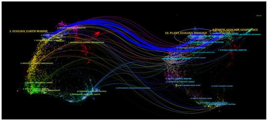 To gain a comprehensive understanding of the evolution of the field, we performed a dual map overlay analysis using CiteSpace. This analysis provides an interactive representation of the relationships between disciplines and the distribution of individual publications from different organizations [98]. The dual map overlay of journals illustrates the subject distribution of journals, with the left side of the graph displaying citing journals and the right side indicating cited journals. The citation relationships between articles in cited journals and articles in cited journals are represented by colored lines [99,100]. A change in the trajectory of citations from one region to another can be used to identify the influence of articles from a different discipline. The depth of these trajectories, as measured by the Z-score, reflects the accumulated citations of the works [98]. Figure 14 provides insight into the citation patterns of works on the impact of climate change on mangrove forests. The dominant citing region, Ecology, Earth, Marine, was found to have influenced two distinct domains, Earth, Ecology, Geophysics (Z-score of 4.17) and Plant, Ecology, Zoology (Z-score of 7.74).
