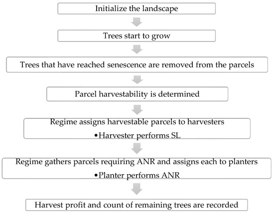 There can be multiple harvesters and planters, while there is always one regime and 256 parcels in one execution of the model. The model was run for 500 simulation years to observe the dynamics between the harvester and planter agents. Except for the first step, the other steps are repeated chronologically until the end of a simulation experiment.