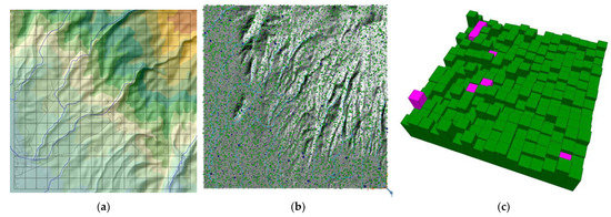 Screenshots of the landscape: (a) landscape divided into parcels, (b) landscape populated with initial distribution of trees, and (c) landscape visualized with initial volume of parcels and location of protected parcels (in magenta).