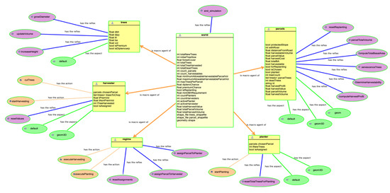 Figure 5 shows the complete overview of the design of the GAMA Forest Model following the conceptual model approach proposed by Taillandier et al. [33]. It also describes the attributes of each agent and the connections between agents as organized inside the GAMA platform.