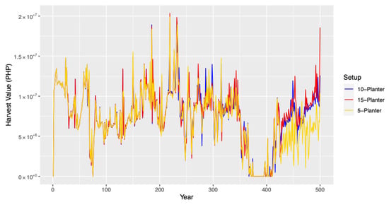 We ran the model for 500 simulated years with three repetitions each and examined the outcome in terms of the yearly harvest value. Only one parameter was altered (number of planters = [5, 10, 15]), while all other values were retained at their default settings. The result of the exploration is presented in Figure 6.