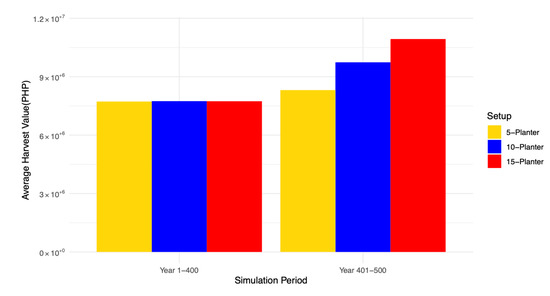 Average harvest value for simulation periods 1–400 and 401–500 on three setups: 5-planter, 10-planter, and 15-planter.