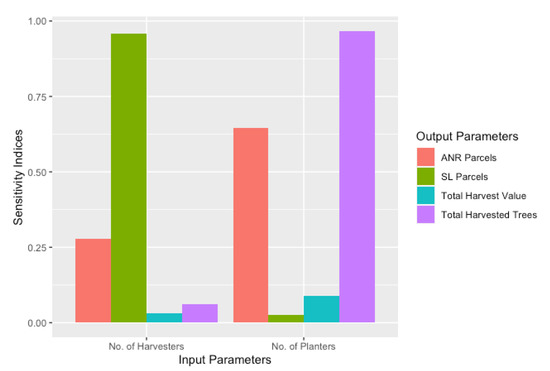 Figure 9 shows that the number of harvesters has a significant impact on the number of parcels ready for SL, while the number of planters has a significant impact on the number of parcels requiring ANR. This means that by changing only the number of harvesters, the capacity of the forest for SL also changes. Furthermore, by changing the number of planters, the need for ANR also changes. Interestingly, the figure also shows that the number of harvesters has a considerable influence on the change in demand for ANR, with a first-order index of 0.28, in contrast to the demand for SL, which is not influenced by the number of planters, with a first-order index of 0.03.