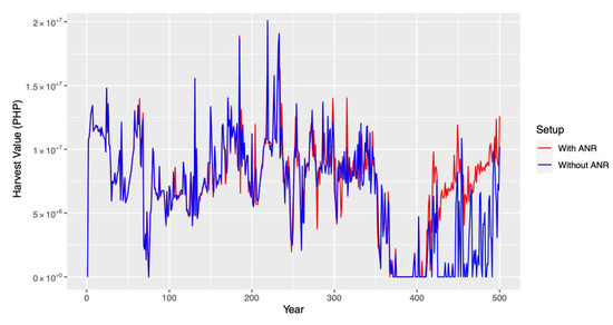Figure 11 shows that for the first 400 years, there was no discernible difference in the harvest value of SL operations with and without ANR, both averaging about PHP 7.7M. Only in the final 100 years of the simulation did the difference between performing ANR and not performing it became apparent. Additionally, the harvest value obtained over the course of the last 100 simulation years for the “with ANR” setup is PHP 6.8M on average, while the “without ANR” setup only made PHP 2.5M. This shows that for up to 500 years, SL operations with ANR can generate a profit that is sustainable.