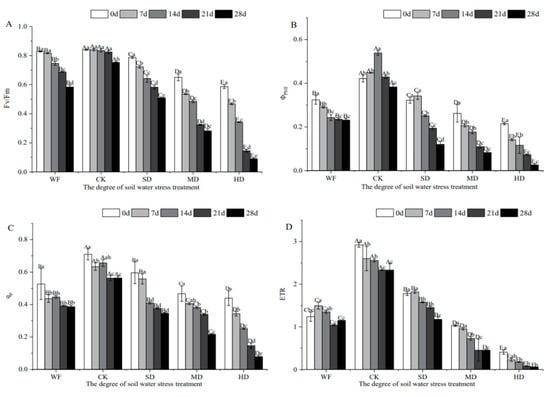 Effects of water stress on chlorophyll fluorescence characteristics of C. retusus leaves. (A) Effects of water stress on Fv/Fm of C. retusus leaves; (B) Effects of water stress on ΦPSII of C. retusus leaves; (C) Effects of water stress on qP of C. retusus leaves; (D) Effects of water stress on ETR of C. retusus leaves. Upper-case letters represent the variations in different treatment groups, and lower-case letters represent the difference in stress days within the group (significant). See the caption for Figure 1 for an explanation of abbreviations.