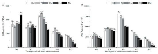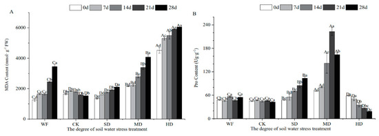 MDA content in the flooded treatment group increased by approximately 90.25% compared with the control group. The slight drought treatment group showed a slowly increasing trend, with an amplitude of 30.08%. However, the moderate drought treatment and high drought groups were significantly increased by 140.84% and 285.31%, respectively, and the high drought group was the most seriously stressed (Figure 5A). The MDA content in the leaves in the moderate drought treatment and high drought treatment groups was significantly higher than that in the control group and reached the highest level in the high drought treatment group at 28 days, indicating that the cell membrane leaf structure had been damaged to different degrees. The MDA content in the leaves in the high drought treatment group was the most seriously affected compared with the other groups, and the difference was significant at the 1% level.