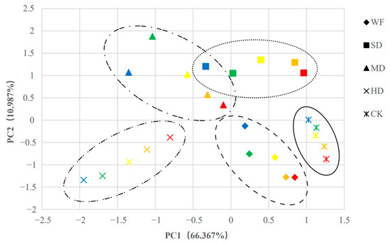 All data were analyzed with SPSS 21.0 software and Origin 2019 software. Two-way ANOVA and the least significant difference method (LSD) were used to test the significance of differences among treatment groups at the 5% level (p = 0.05). For principal component analysis (PCA), data (Xij) were standardized to their standardized value (Zij) according to Equations (5)–(7), in which i is the treatment factor, and j is the time factor. The results are shown as means ± SD, and different letters indicate significant differences.