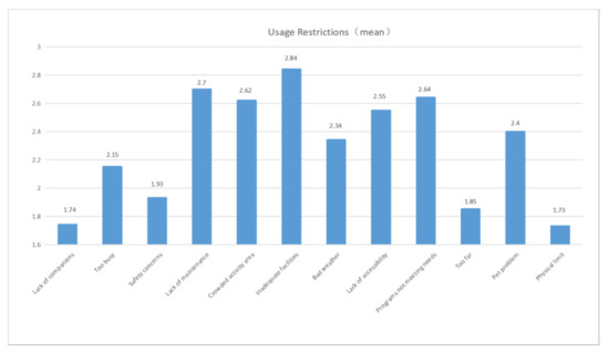 The third limiting factor is that the programs are not meeting the needs of residents (MD = 2.64), with age and occupation having a significant impact. According to age, residents aged 46–55 years old (OR = 0.47, p < 0.05) are less affected by the inability of the programs to meet their needs compared to those over 60. Meanwhile, students (OR = 0.49, p < 0.1) were 0.49 times more constrained than the unemployed. The community projects consist of regular entertainment events, public welfare activities, and various clubs. These activities are particularly important for vulnerable groups within the community. The young group hopes to add more projects aimed at young residents, such as outdoor movies, basketball, badminton, and others. On the other hand, seniors also feel that there are too few activities and want to add more meaningful cultural and recreational activities. A lack of outdoor space is one of the main reasons for the lack of activities. Residents of different age groups usually share a square, and some old residential neighborhoods with relatively poor conditions have no activities. According to Eyler et al. [67], some organized activities can increase women’s participation in community activities. Many studies have also demonstrated that community activities have a positive effect on both physical and mental health [68].