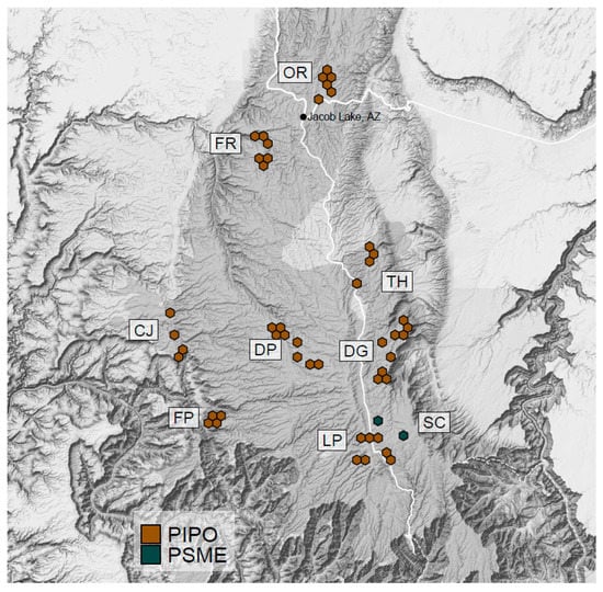 The Kaibab Plateau is located north of the Grand Canyon and is part of the Colorado Plateau region (Figure 1). The highest plateau in Arizona, the Kaibab Plateau varies from pinyon–juniper woodlands at the low-elevation periphery to spruce–fir and aspen at the highest elevations in the center [,]. Dominant species include subalpine fir (Abies lasiocarpa Nutt.), Engelmann spruce (Picea engelmannii Parry), blue spruce (Picea pungens Engelm.), Douglas-fir (Pseudotsuga menziesii Franco.), white fir (Abies concolor Hildebr), quaking aspen (Populus tremuloides Michx.), ponderosa pine, gambel oak (Quercus gambelii Nutt.), pinyon pine, and Utah juniper (Juniperus osteosperma Little). The plateau stretches roughly 48 km N–S and 25 km E–W, ranging from 1830 m to 2800 m elevation. Average annual temperature from 2001 to 2020 was 15.8 °C daily maximum and 2 °C daily minimum near Jacob Lake []. Annual precipitation is largely bimodal, with summer monsoonal rains and winter snow providing an average of 53.0 cm of precipitation annually. The southern tip of the Kaibab Plateau is managed by the National Park Service, while the majority of the plateau is part of the Kaibab National Forest. Before European settlement, the natural fire regime was largely low severity, isolated surface fires with the occasional landscape-scale fire burning at 31-year intervals []. After the 1880s, natural fires were suppressed on the plateau until recently and no fires were recorded that scarred more than 25% of sampled trees [].
