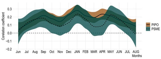 While ponderosa pine and Douglas-fir have been found to have similar correlations with climactic patterns, it is important to examine this locally before using a non-host to correct for host tree climate responses []. We used monthly precipitation dating back to 1895 to examine the climate correlations of the host and non-host chronologies using Pearson’s correlation coefficient [,].