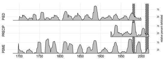 Effect of using different non-host inputs, represented by percent of defoliation of host tree series: pinyon pine chronology AZ129 (PIED), annual instrumental precipitation (PRECIP), and the combined Douglas-fir chronologies used for this study (PSME). Crosshatched regions are observed outbreak periods. The 1978–1984 outbreak is evident in the precipitation and PIED non-host but masked in the PSME results.