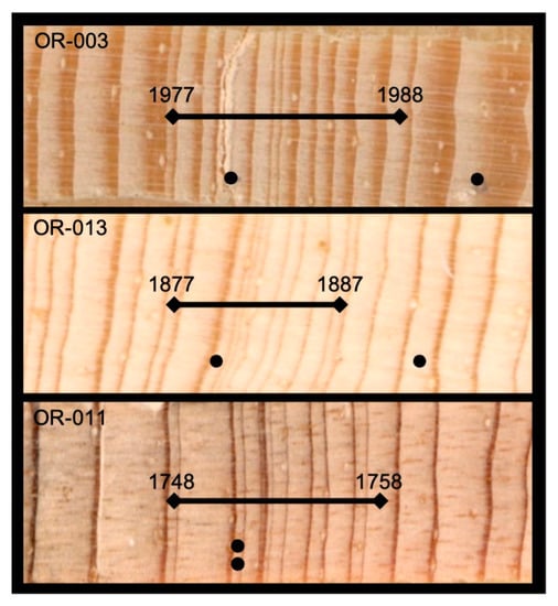 Many suppression periods were apparent when visually inspecting the host core samples, appearing in the 1810s, 1850s, 1880s, and 1930s. Many of the suppression events in the tree rings had the characteristics of pandora moth signatures described in other studies: thin latewood and an anomalously small or missing series of rings that persisted for over ±eight years (Figure 4) [,,]. We dated 181 trees (137 host and 44 non-host) totaling ~39,000 rings, extending back to 1685.