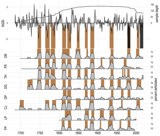 Pandora moth outbreaks at the landscape (top) and site (bottom) scales. Sites are ordered from north (top) to south. Brown bars represent inferred outbreak periods at the site or plateau scale and crosshatched regions are historically observed outbreaks. The landscape outbreaks are represented in normalized growth suppression index and the site outbreaks are percent of trees indicating a defoliation event by site with shaded regions representing site-wide outbreak periods.