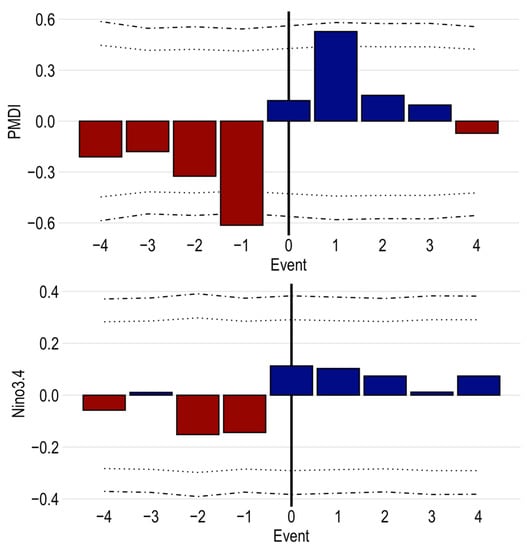 Superposed epoch analysis comparing site outbreak initiation dates (n = 47) with Palmer Modified Drought Index and El Niño/Southern Oscillation Niño 3.4 reconstructions. Bars represent the departure from mean index at the indexed year—red are dry, blue are wet years. The dotted and dashed lines represent the 95% and 99% confidence intervals, respectively.