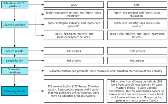 To locate relevant studies, a search was conducted using the databases Web of Science (WOS) (https://www.webofscience.com, accessed on 30 June 2022) and China National Knowledge Infrastructure (CNKI) (https://www.cnki.net, accessed on 30 June 2022). This study used the following search terms: “Eco-industry” and “eco-product” together and “eco-industry”, “ecosystem services”, “eco-product”, and “value realization”, as well as “ecosystem services” in combination with “value realization”. The removal of irrelevant papers was performed via artificial selection. The search had a 30 June 2022 deadline. The search retrieved 520 relevant Chinese and English language studies, of which 158 were in English, including 127 theses, 27 review papers, 3 proceeding papers, and 1 study that was published online; however, there were no editorials or book chapters. In the English-language journals, 78 articles were written by Chinese scholars. Of the remaining 362 articles from Chinese periodicals, 208 were from core Chinese journals, 64 were Master’s theses, 13 were Doctoral dissertations, 16 were conferences papers, 58 were articles from newspapers, 1 was a book, and 2 were achievements. No yearbooks, patents or standards were found. The procedure for the literature screening and search is depicted in Figure 1.