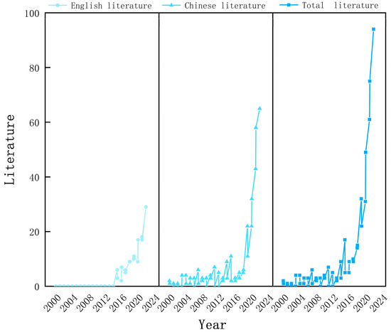 There are roughly three stages regarding research on the realization of eco-product value and the eco-industry both domestically and abroad (Figure 2). In the first stage (1985–2009), there were only about 55 total studies and not many articles published yearly—the topic was still in its early phases. In the second stage (2010–2020), there were some significant fluctuations in the number of articles; however, it was still in a stage of slow growth—only 101 articles were published during that period. In the third stage (2021–30 June 2022), there was a trend was toward rapid growth, and there were currently many articles published during this period.