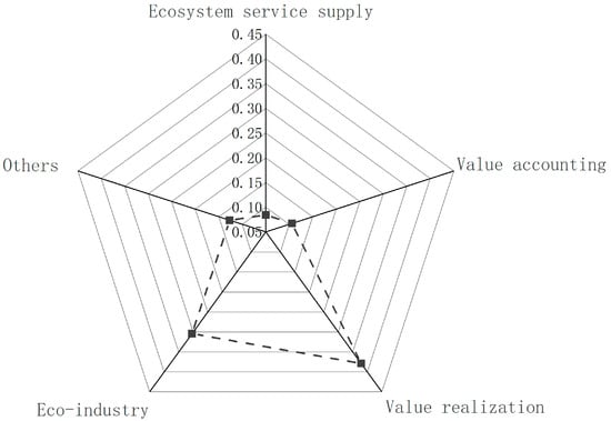 Of the studied categories, ecosystem service supply papers comprise 8.46% of the total number, value accounting comprise 10.58%, value realization comprise 37.88%, eco-industry comprise 30.38%, and other categories comprise 12.69% of the total papers published (Figure 3). The ratios of these articles show that eco-products are worth attaining and the state of eco-industries is improving. However, current research in this area still focuses on how eco-product value is realized, and how the eco-industry is established, while ecosystem service supply and value accounting is still in the exploratory and development stages.