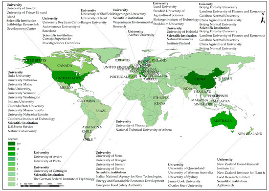 The breakdown of the institutions and nations described in the study (due to space limitations, only countries with more than two publications are marked). The number of publications is indicated by the bottom digits and bands of different colors; the greener the color, the more publications are cited.