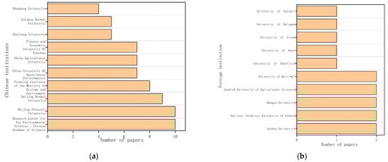 The distribution of eco-industry-related organizations and eco-product value realization was interpreted and analyzed. This paper utilizes the employer institution of the primary authors of the available literature as units, since there are multiple institutions with relevant publications and only a limited amount of graph space. Only those units with more than four published papers were considered in the selected Chinese literature and only institutions with one paper in foreign studies, totaling 10 units (Figure 5). The top Chinese institutions (Figure 5a) in terms of the number of studies comprise the Research Center for Eco-Environmental Sciences, the Chinese Academy of Sciences (10), the Beijing Forestry University (10), the Beijing Normal University (9), the Environmental Planning Institute of the Ministry of Ecology and Environment (8), the China University Of Geosciences and China Agricultural University and Finance and Economics University Of Lanzhou (7), and the Zhejiang University and Guizhou Normal University (5). The top English-language institutions that have published two relevant articles include Aarhus University, the National Technical University of Athens, Bangor University, the Swedish University of Agricultural Sciences, and the University of Helsinki (Figure 5b). Among all research units, there are more domestic than foreign research units. Almost all of the top research units are agricultural and forestry institutions of higher education, which are located in both forested and highly developed regions.