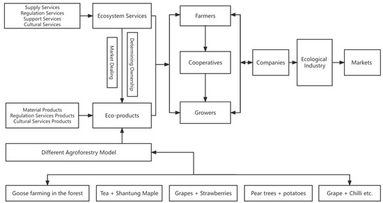 Industrial colocalization, as well as ecological industrialization, are both theoretical and policy-based issues, and they have not yet been completely “solved”. In-depth research is also needed in theory, especially the dynamic, incentive, restraint, price, and investment mechanisms, as well as industrial regulation, industrial organization, market organization, and market regulation theories [120]. In addition, the coupling connection between ecological governance and industrial growth in ecologically fragile regions should be researched and a coupling collaboration extent prototype between ecological governance, as well as sourced ecological businesses in ecologically fragile places should be formed. The goal of these studies and models is to assist in methodically comprehending and properly assessing the coordination condition of environmental governance and the industrial economy in ecologically vulnerable places [121]. In the future, to explore the coupling relationship between karst agroforestry ecosystem services and eco-industries and the formation mechanism of the industry, research theory should be improved, contributing to the sustainable and coordinated development of agroforestry products and agroforestry industries in karst areas. Therefore, the best agroforestry models should be studied in karst ecological restoration areas to promote local development. Figure 6 depicts the ecological processes, by which different agroforestries form eco-industries.