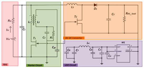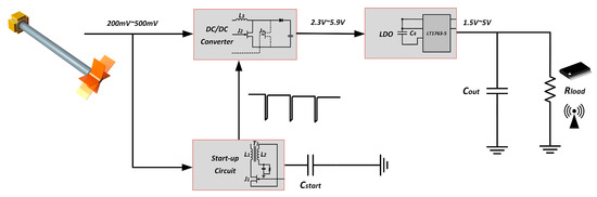 The TEG is often at the microwatt to milliwatt level due to its own small temperature gradient, and its terminal voltage is not a stable value, so a PMS must be connected to the back end of the thermoelectric conversion device in order to provide stable power to the forestry WSNs [25,26,27]. There are published micro-energy power systems based on discrete components [28], integrated circuits [29], and commercial chip-based power systems [30], but for the practical application requirements of the shallow soil–air temperature difference power system designed in this paper, often the design cost is not only greatly increased due to some extraneous performance, but also does not take into account the low input voltage of this thermoelectric conversion device, which can no longer afford problems such as the power consumption of external driving elements. In order to satisfy the drive of its own transistors as well as the ultra-low input boost, this study designed a 200 mV ultra-low voltage start-up PMS based on the designed shallow soil–air temperature difference power generation device. As shown in Figure 2, when the output voltage of the TEG rose to 200 mV, the start-up circuit turned on and provided pulses to the transistor switches of the DC–DC converter, and as the output voltage of the converter increased, a low-voltage differential linear regulator was added at the end to fix the final output at 1.5 V~5 V.