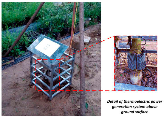 To verify the performance of the thermoelectric conversion device, test platforms were constructed in northeast China (45°14′ N/126°12′ E). As shown in Figure 4, the shallow soil–air thermoelectric power generation system, which was buried 3.5 m underground and about 0.2 m above the ground surface, was used to measure the temperature of the heat-absorbing fin at the heat-absorbing end of the gravity-assisted heat pipe Tunder (at 3.5 m underground), the temperature of the hot end of the TEG, Tte, and the air temperature, Tair. Meanwhile, the electrical output characteristics such as open-circuit voltage Vte(oc) and short-circuit current Ite(sc) of thermoelectric power generation system were measured. The TP1608 data collector (TOPRIE, Shenzhen, China) and the power management system were placed in a waterproof box on top of the thermoelectric conversion device to prepare for the subsequent power supply of the wireless sensor nodes and other functions.