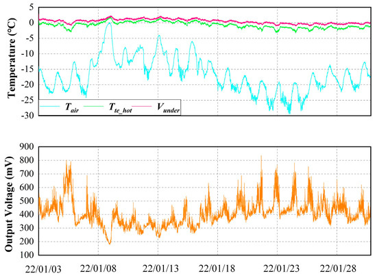 In this paper, selected temperatures and output open-circuit voltages at various locations of the shallow soil–air thermoelectric power generation system for January 2022. As shown in Figure 5, the temperature at 3.5 m below ground did not fluctuate much and almost showed a horizontal line. Since the TEG is exposed to the air through the heat dissipation fins, the hot end of the TEG was still subject to some fluctuation by the change in air temperature, and the change was kept between 0 °C and 3 °C. Meanwhile, the temperature of the hot end of the TEG also had a temperature difference of 1 °C~2 °C from the temperature of the heat absorbing fins at 3.5 m underground, which was caused by the heat loss in the process of heat transfer by the gravity-assisted heat pipe. It is worth noting here that the output open circuit voltage Vte(oc) of the thermoelectric power generation system is the critical design indicator for the power management system as the input parameter of the back stage power management system according to Equation (12). As shown in Figure 5, the maximum input voltage could reach 803.36 mV as Vte(oc) was greater than 200 mV most of the time. Based on Equations (12) and (15), parameters such as switching transistor IDSS and Vgs(off) can be determined from the manual, thus the transformer turns ratio L1/L2 = N1/N2 can be identified.
